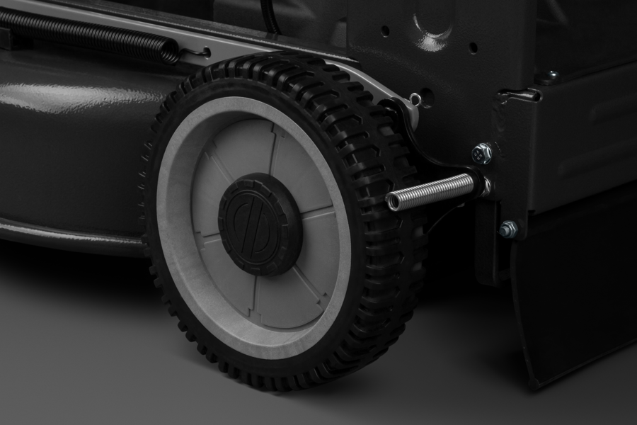 Колеса на двойных шарикоподшипниках в закрытой обойме имеют длительный срок службы. Стальные пружинные скребки удаляют мульчу с протектора и не оставляют комки травы во время скашивания. ??