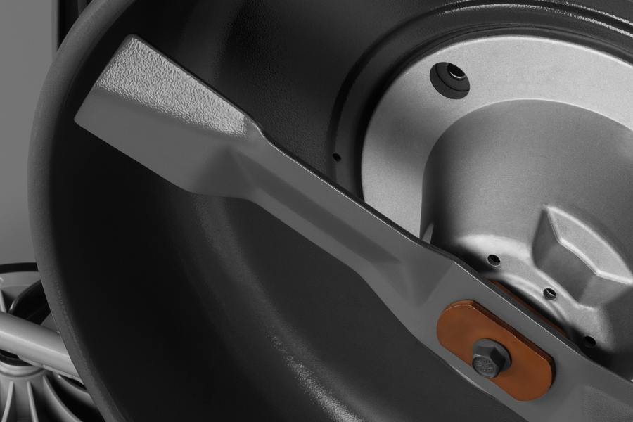 Мощные быстросъемные алюминиевые зажимы позволяют быстро отрегулировать положение рукоятки под любого оператора, сохраняя при этом жесткость конструкции. Рукоятка соединена с корпусом газонокосилки с помощью мощного стального кронштейна, который эффективно снижает вибрацию и повышает срок службы узла. ??