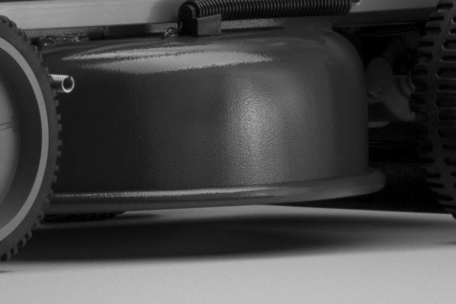 На деку газонокосилки нанесено специальное ударопрочное покрытие. Каждый из трех слоев краски – базовый, с молотковым эффектом, финишный лак – проходит процесс обжига для плавления и полимеризации материала. Такое покрытие прочнее, чем стандартная покраска. Благодаря этому косилка надежно защищена от царапин, ударов и влажности. ??